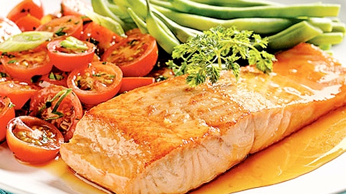 Filet de saumon grillé à l’huile d’olive citronnée, mixte de légumes et pomme nature.